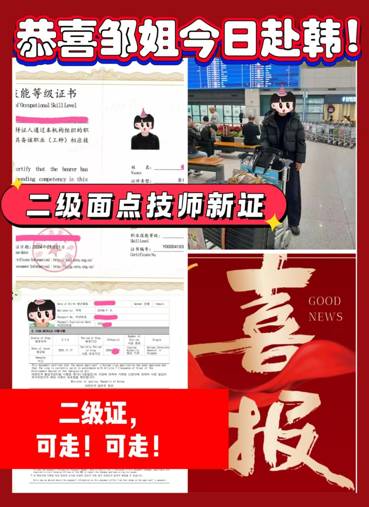 近日,公司再傳捷報:來自沈陽的面點師女士憑借二級技師證,僅用短短數便成功獲批韓國 E-7-2 工作簽證,即將入職大田甜蜜北京(化名),月薪達 260 萬韓元(約合人民幣 1.25 萬元),開啟三年海外職業征程。