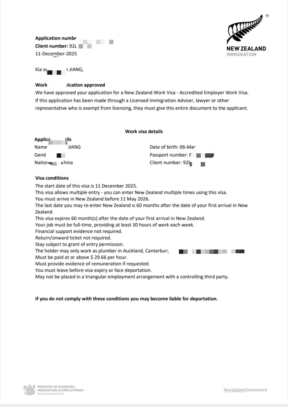 剛送走前幾天成功獲批的新西蘭技術(shù)工人,今天我們公司又迎來了一個重磅好消息 ——又一位水工師傅的新西蘭工作簽證順利下簽!短短時間內(nèi)接連拿下新西蘭技工簽證,這不僅是客戶自身實力的體現(xiàn),更是我們公司專業(yè)服務(wù)能力的有力證明!